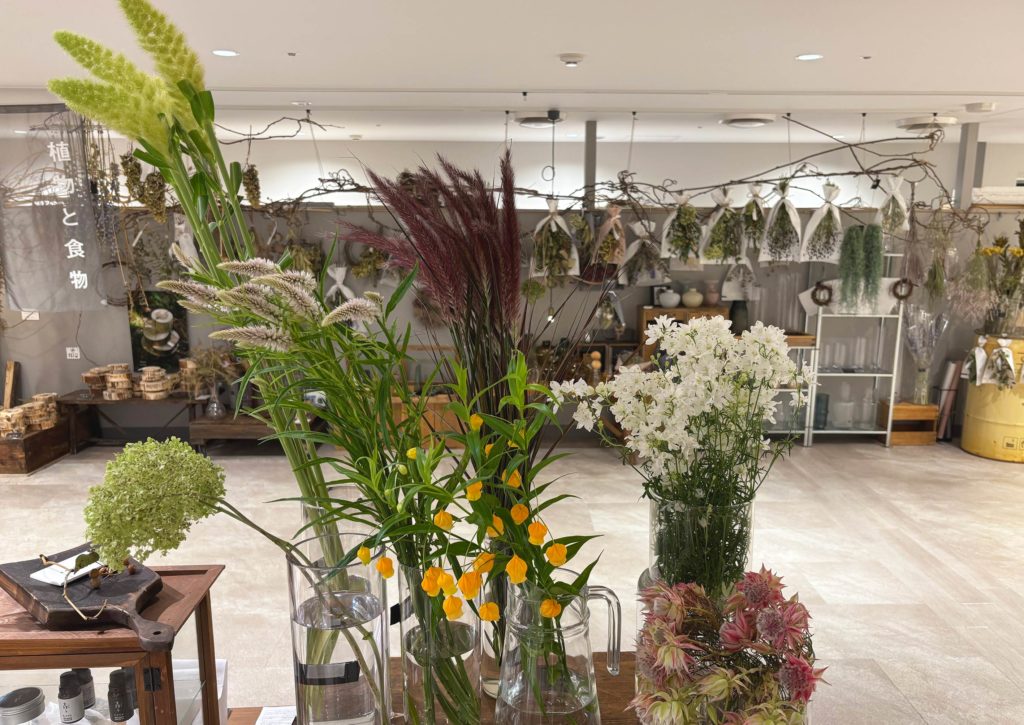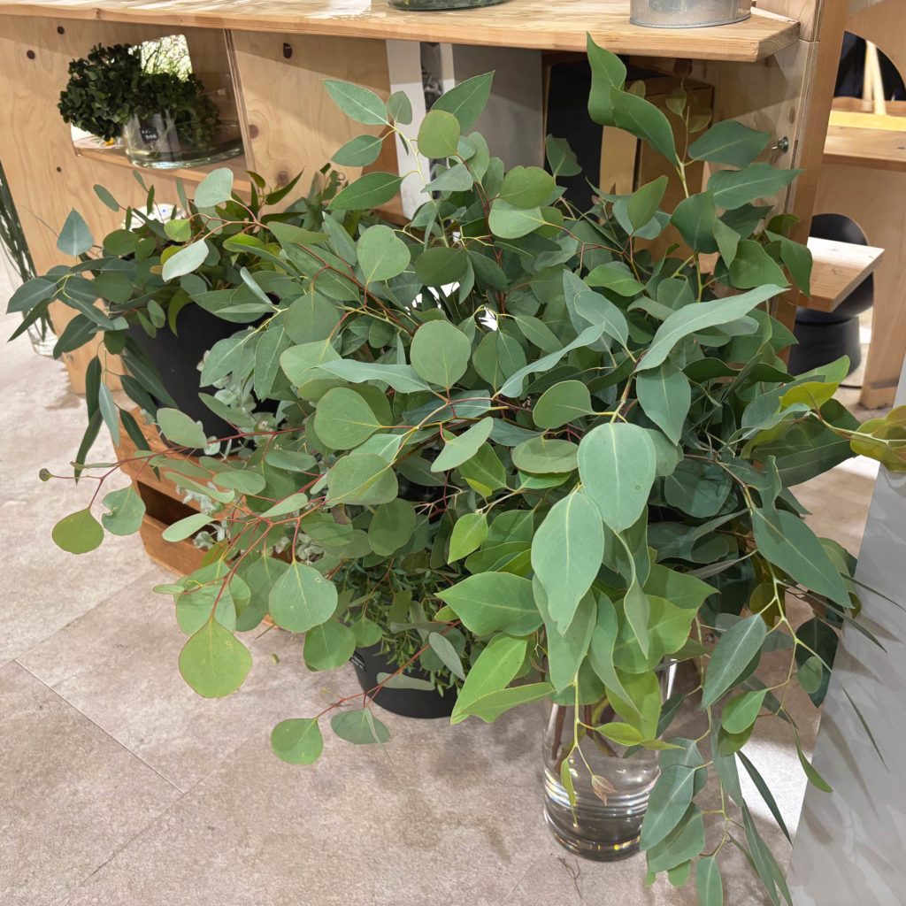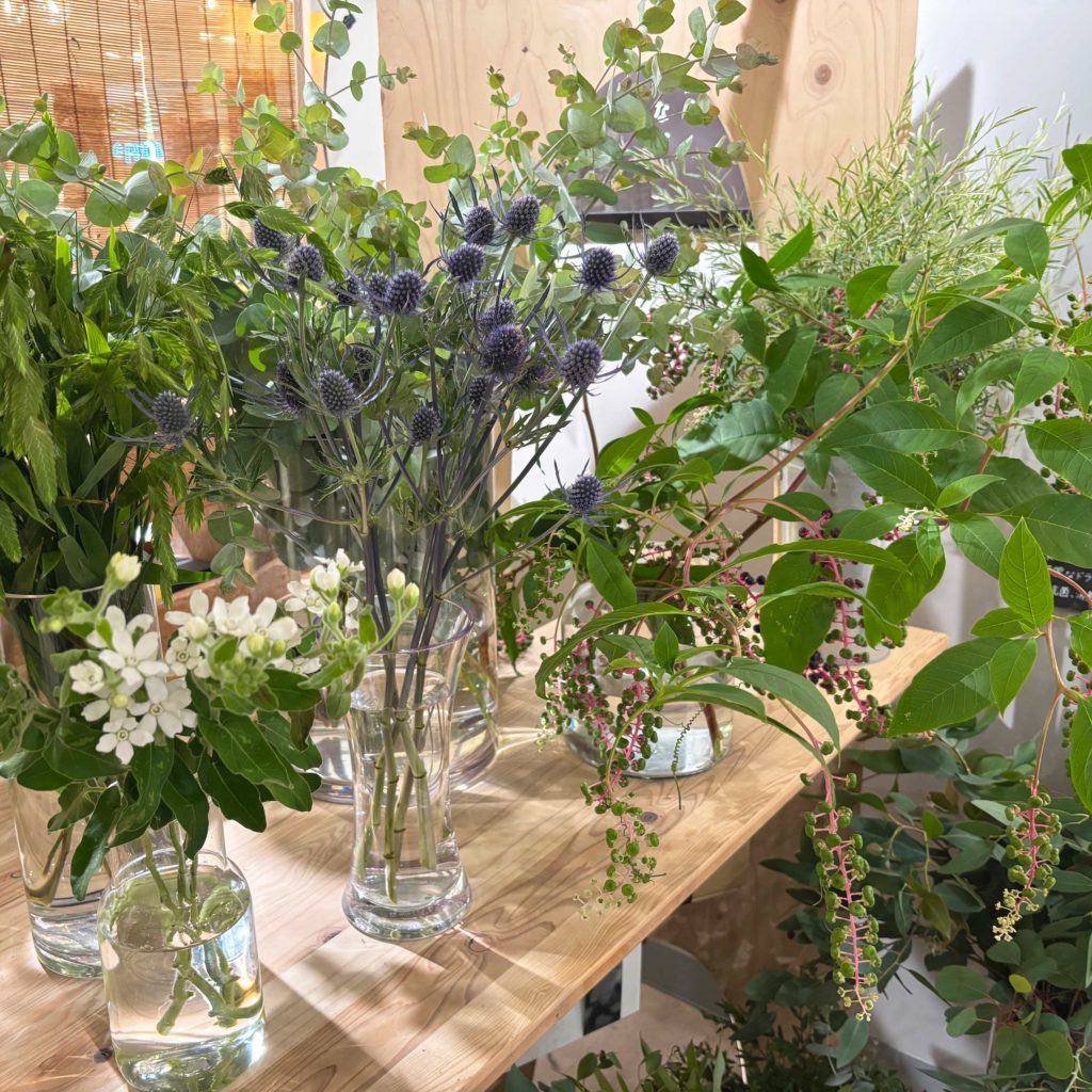 そのご縁が植物にも広がり、春には宮若市や宗像市のミモザ、初夏には星野村のお茶の木、夏の盛りには宮若市で育ったユーカリやティーツリーなどが店頭に並びます。その多くはスタッフが生産者の元に通い、直接集めてきたものです。