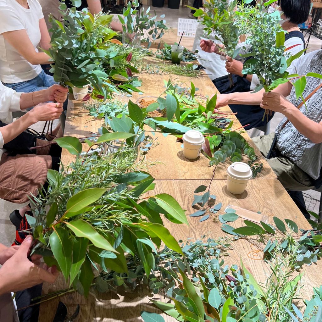 「ユーカリなどで仕立てるスワッグは、香りがとてもいいんです。しばらくは生花の美しさを、その後はドライになる過程も楽しめます」と、植物コーディネーターの谷さん。定期的に開かれるワークショップには、季節ごとに通うリピーターも多いといいます。