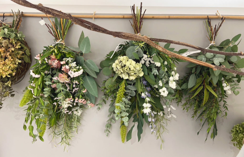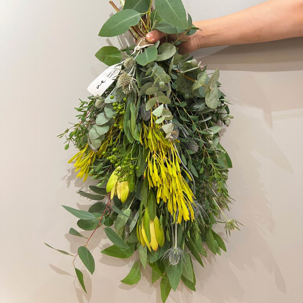 また、お店ではロスフラワーを出さない工夫もしています。切った小枝や小花はミニスワッグに、下葉として整理したユーカリの葉もドライにして販売するなど、命ある植物を余す所なく使いたいという、谷さんの思いが伝わります。