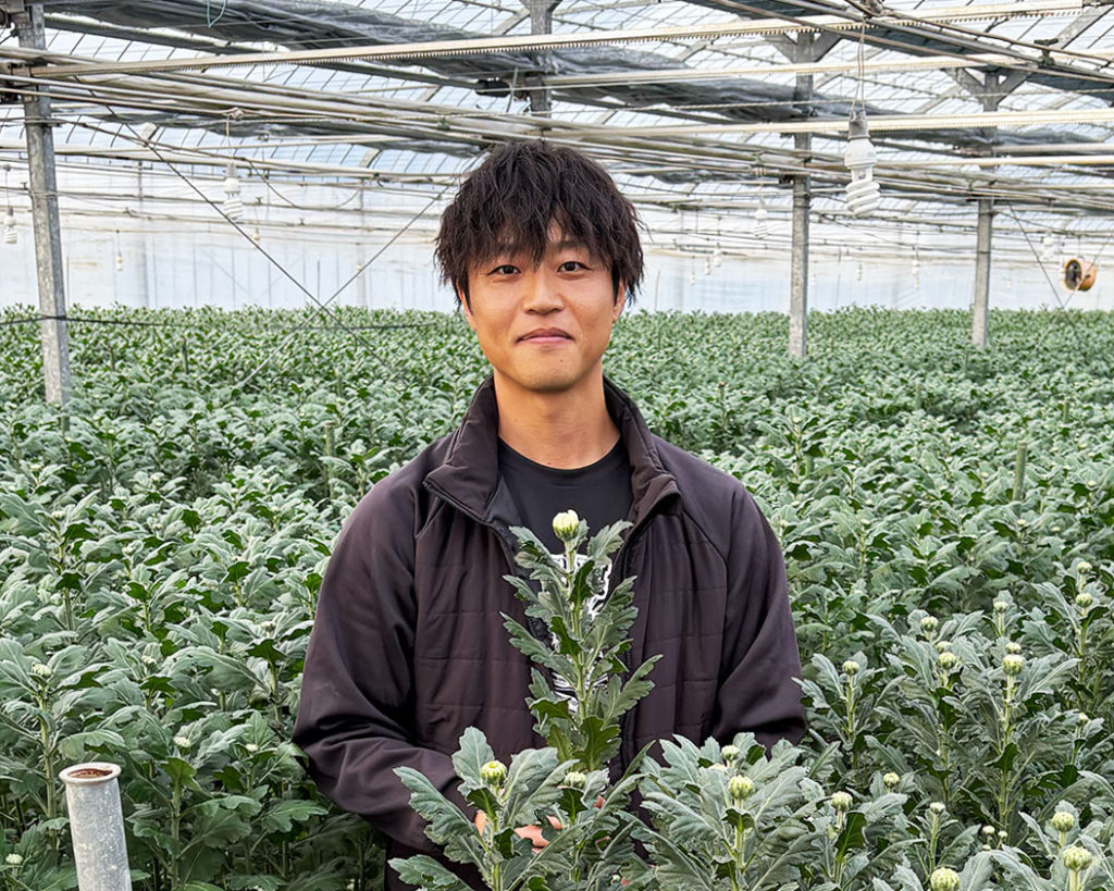 就農して5年。菊の栽培方法は両親から学びながら、独自の水やり方法を試すなど、試行錯誤を重ねる裕太さん。「自分が菊農家になって初めて両親の苦労を実感した。この先、両親に負担をかけすぎないよう、妻や弟と力を合わせ、先々を見据えていきたい」と話します。