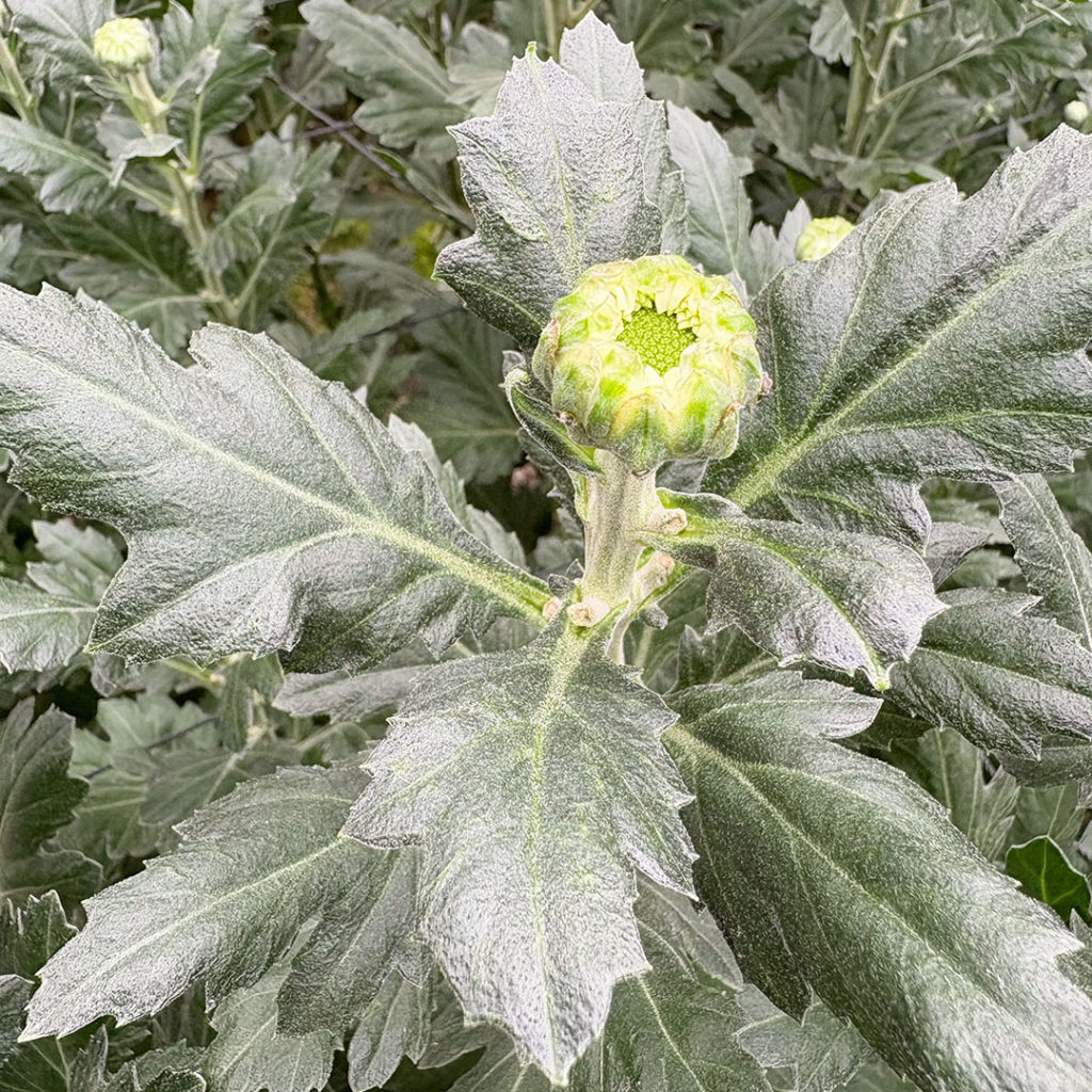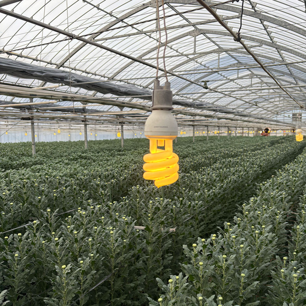 執行さんのハウスでは、夜に電照することで開花を遅らせ、その間、草丈を伸ばしながらこまめに脇芽を摘んでいきます。草丈が50cmになったら消灯し、そこからはつぼみが大きくなるよう促します。久留米の菊には「長さ」が求められているので、90cm以上に育ったら出荷です。