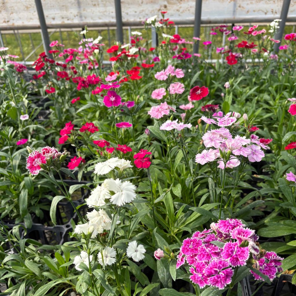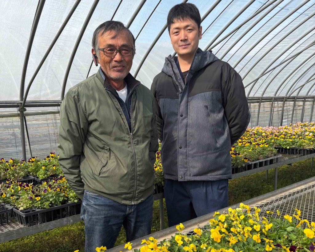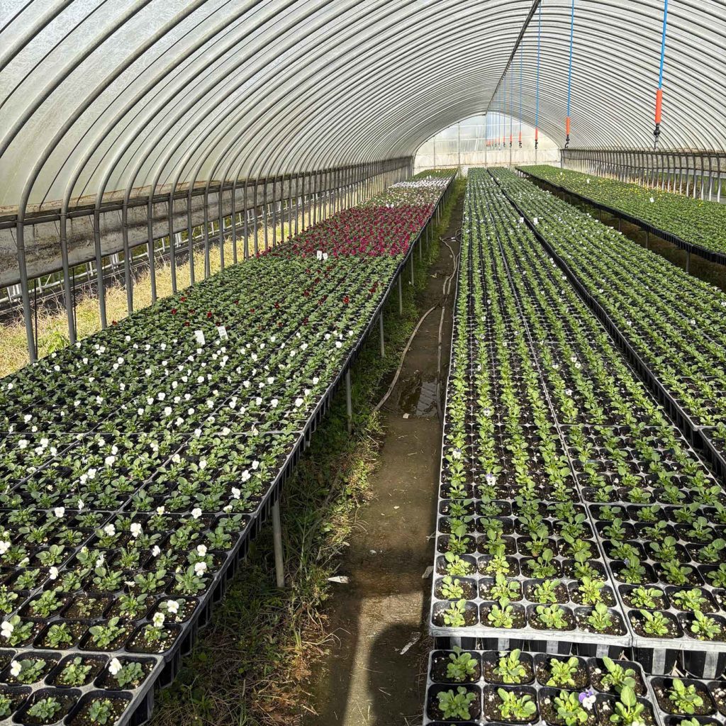 現在では、100aの敷地で約50品目・300アイテム以上を育て、年間生産鉢数はおよそ80万ポット。主力品目はパンジー、ビオラ、ペチュニアなどで、福岡県内の市場へ出荷するほか、花壇用など自治体からの需要にも応えています。