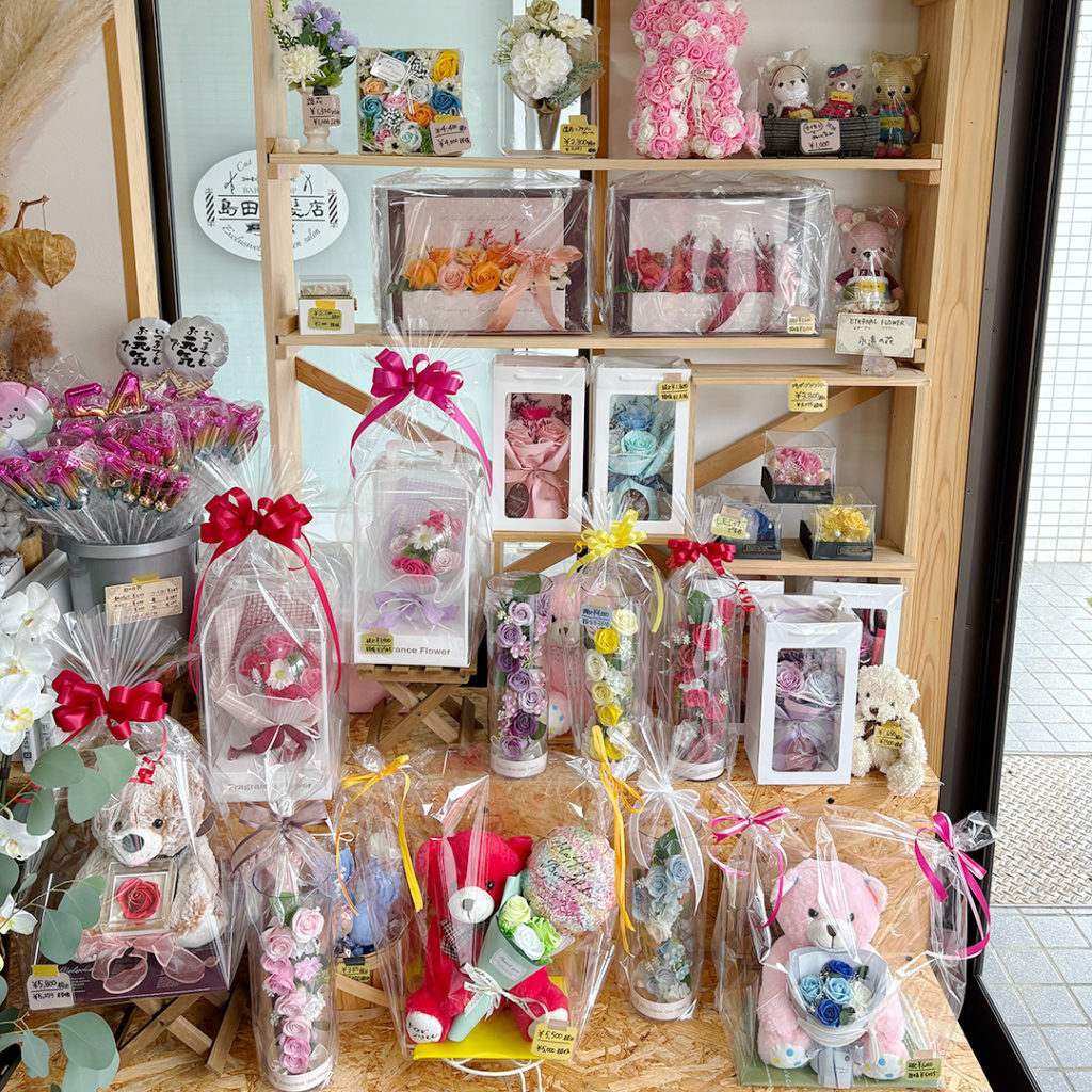 切り花、花束、アレンジメント、観葉植物や胡蝶蘭など鉢もののほか、ソープフラワーなどのギフト商品も充実。生花スタンドにも対応しています。
